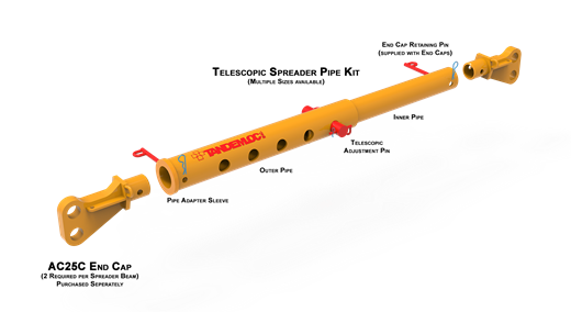 Our Telescopic Spreader Beam Kits give you the versatility to customize by length, capacity, or top rigging setup in convenient increments of only a few inches. Kit includes one pipe adapter for over one end cap, one outer pipe, one inner pipe, one outer pipe pin, and one adjustment pin. Durable and abrasion-resistant; features a sandblasted and primed finish painted in Safety Yellow.